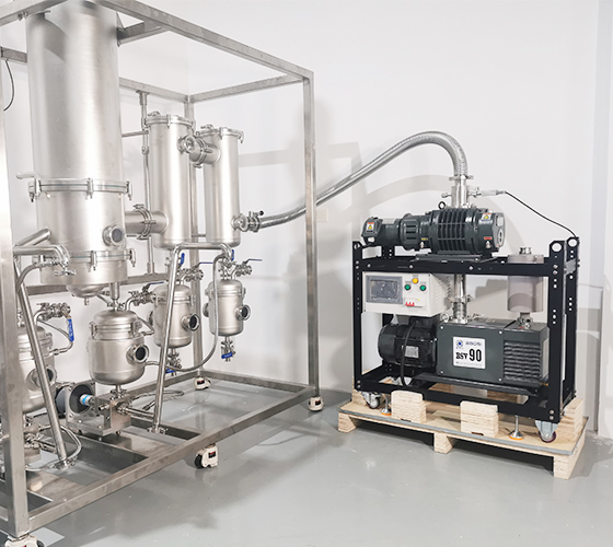 Molecular distillation is a special liquid-liquid separation equipment. Unlike traditional distillation, it relies on the boiling point difference separation principle, but on the difference of the average free path of different substances. When the liquid mixture flows along the inner wall of the main evaporator and is heated, light and heavy molecules will escape from the liquid level and enter the gas phase. Due to the different free paths of light and heavy molecules, the molecules of different substances move different distances after escaping from the liquid level. After passing through the built-in condensate pipe of the main evaporator, the light molecules reach the condensate pipe and are discharged, while the heavy molecules cannot reach the condensate pipe and are discharged along the mixed liquid, So as to achieve the purpose of material separation.